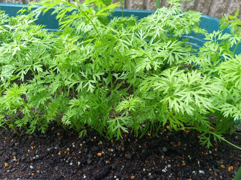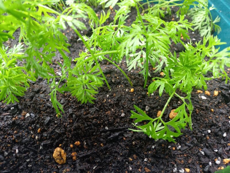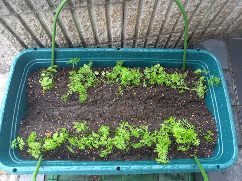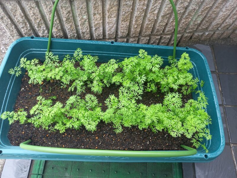 ニンジンは本葉が2~3枚出た頃に、小さい芽や徒長している芽を選んで2~3㎝間隔になるように間引きする。