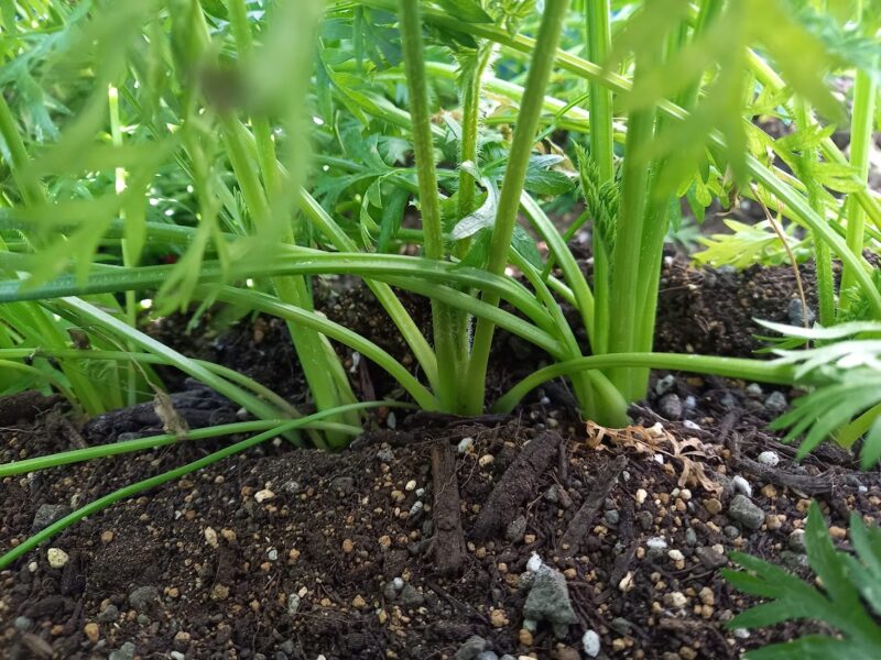 ニンジンは本葉が2~3枚出た頃に、小さい芽や徒長している芽を選んで2~3㎝間隔になるように間引きする。
