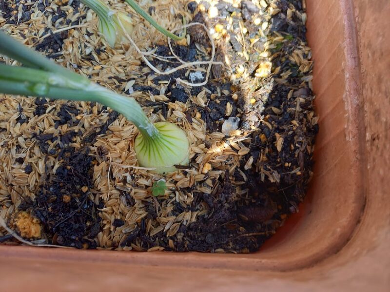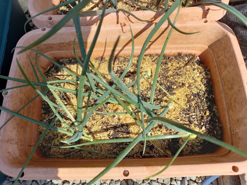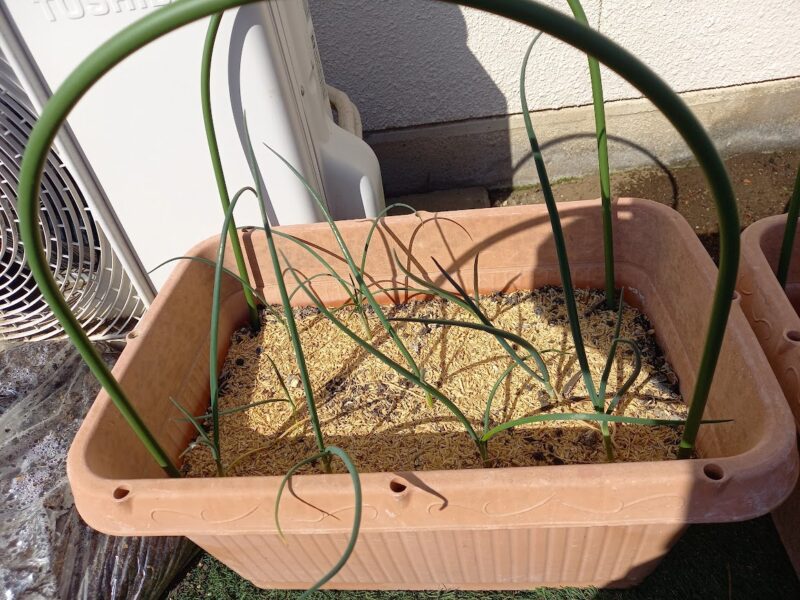 こちらのプランター栽培の極早生たまねぎは、1日中、日が当たる所に置いてあります。
