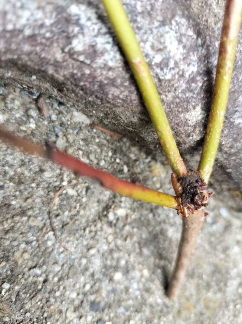 - 枝の根元で切る➡枝の途中で切ってしまうと、そこから枝分かれするように成長してしまい枝同士が絡み合う原因になります。