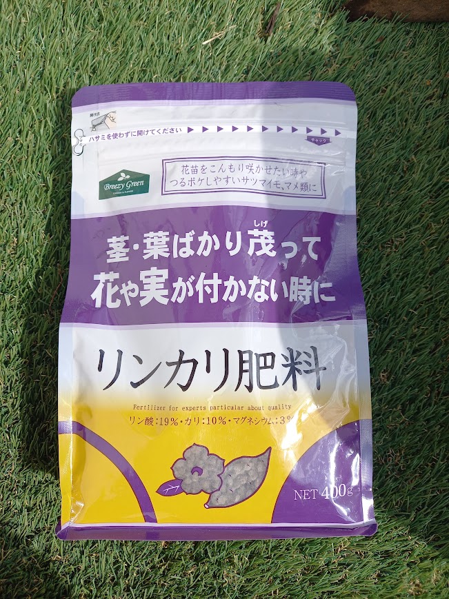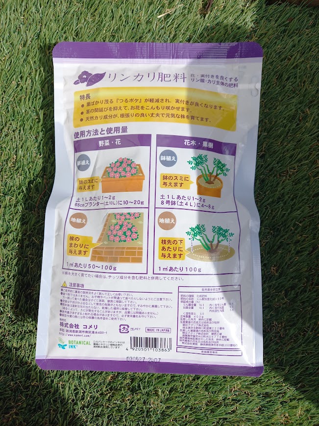 8-8-8の化成肥料でも良いようですが、今回はつるボケにならないようにリンカリ肥料にすることにしました。