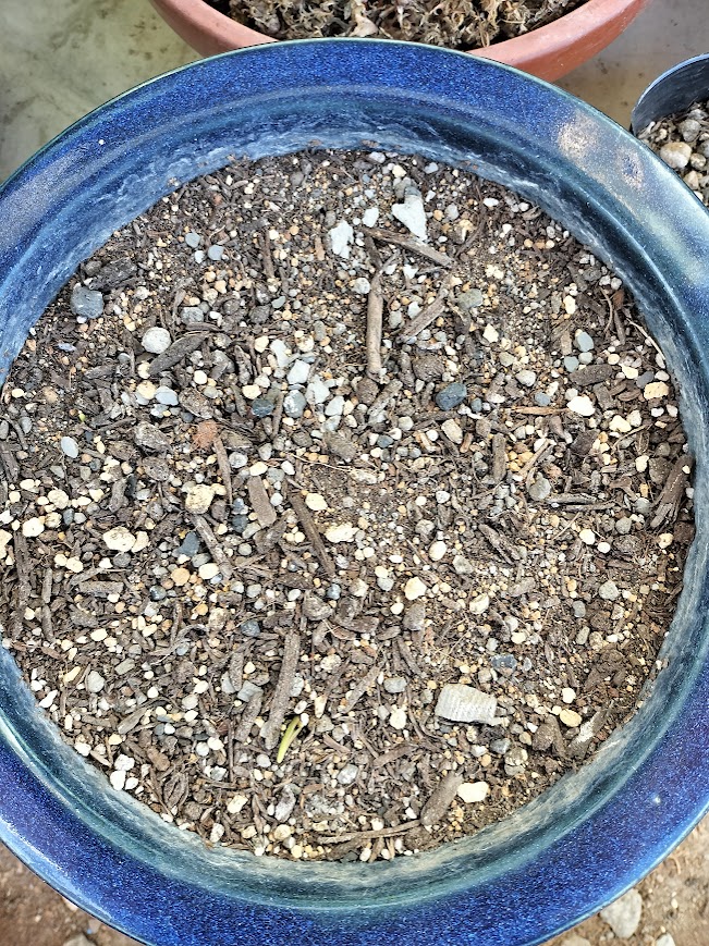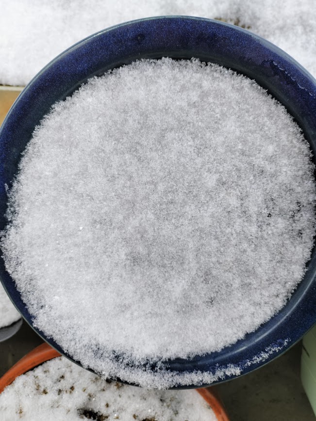 風も強く吹いていて、軒下に置いていた原種系チューリップの鉢にも雪が積もってしまいました💦