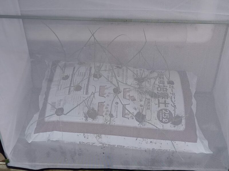 土の上にもみ殻をまいて更に風よけのため防虫ネットで覆いました。